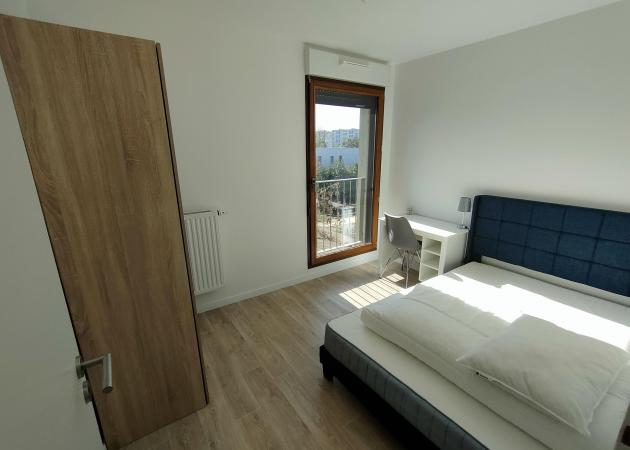 Les chambres lumineuses sont louées avec un lit double, un chevet, un bureau, une chaise, et une penderie.