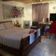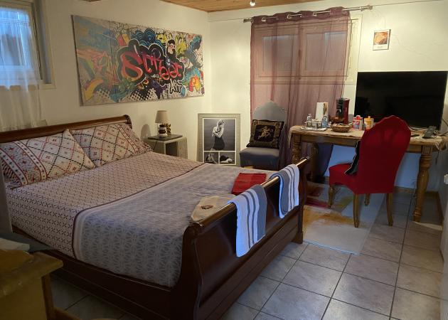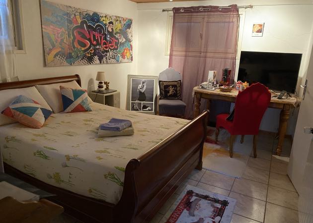 Jolie chambre avec salle de bain privée attenante, confortable et équipée d’un dressing, d’une Tv avec accès Netflix, d’un coin bureau et repas.