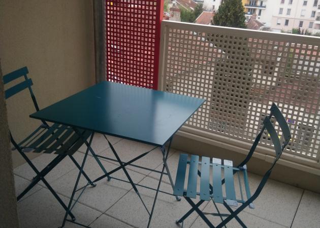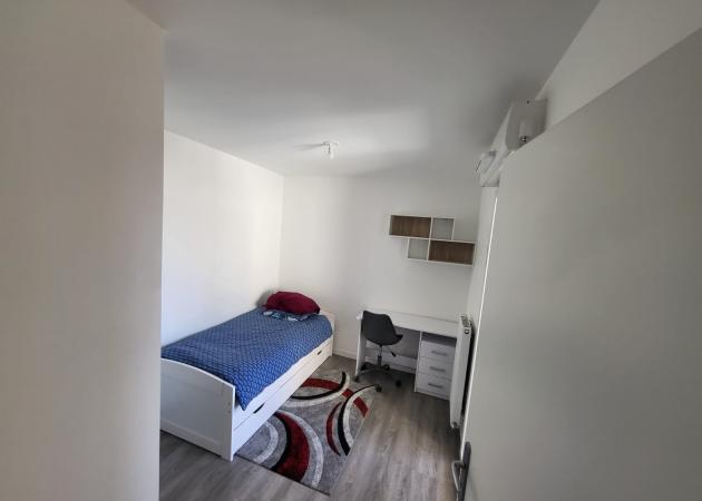 Lit simple gigogne, bureau, étagères, placards dans la chambre qui donne sur une belle loggia de 6 m2 et située à l'opposée de la chambre principale (intimité préservée).