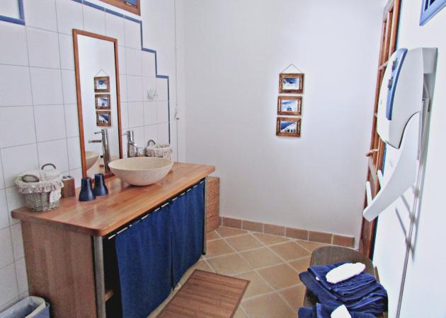 • La salle de bain vous offre une cabine de douche moderne, une vasque élégante, ainsi qu’un soufflant et un sèche-serviettes pour un confort absolu.