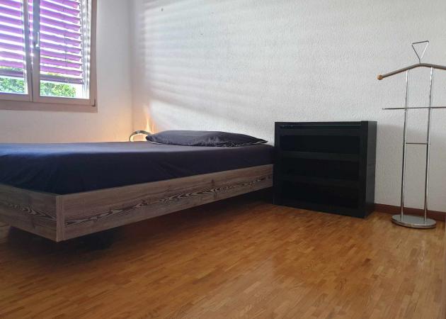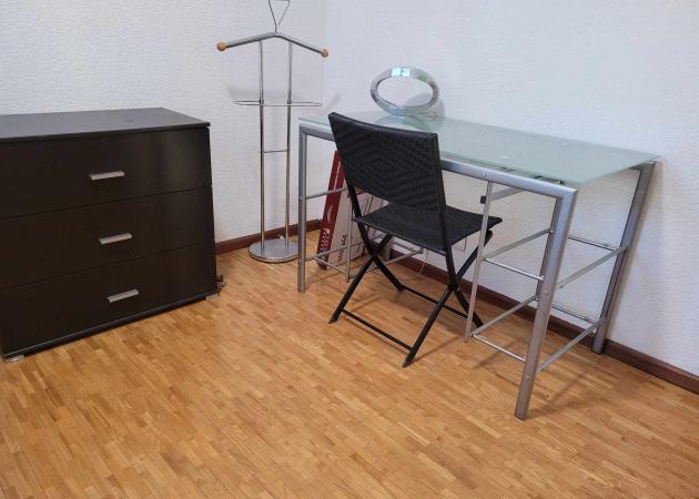 Chambre meublée avec un lit 140 x 200, un petit bureau et une commode.