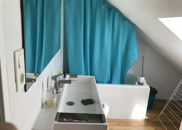Petite salle de bains attenante et privative avec lavabo, baignoire et WC