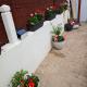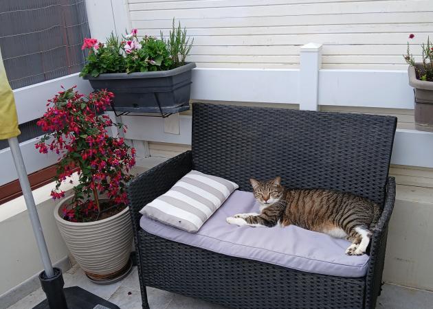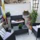 Jardin et terrasse aménagés avec salon de jardin et barbecue électrique.