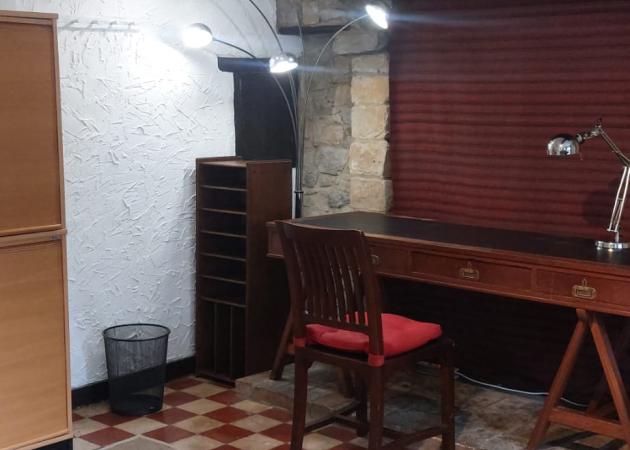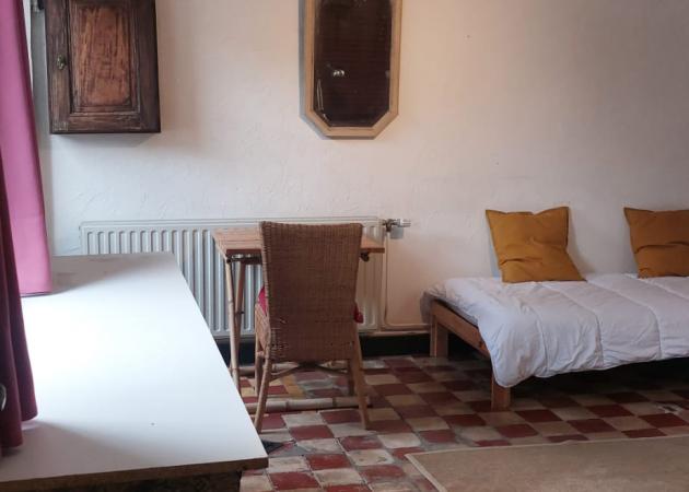La chambre est équipée d'un lit 1 personne 200x90 d'une table avec chaise, d'un grand bureau + chaise, lampe de bureau, lampe sur pied, 1 fauteuil, 2 armoires.