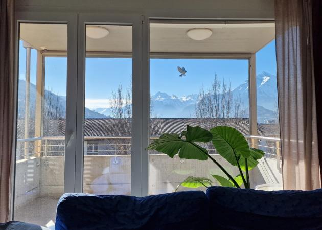 Grande TV, double canapé, cuisine entièrement équipée, petite terrasse dégagée avec vue sur les montagnes.