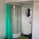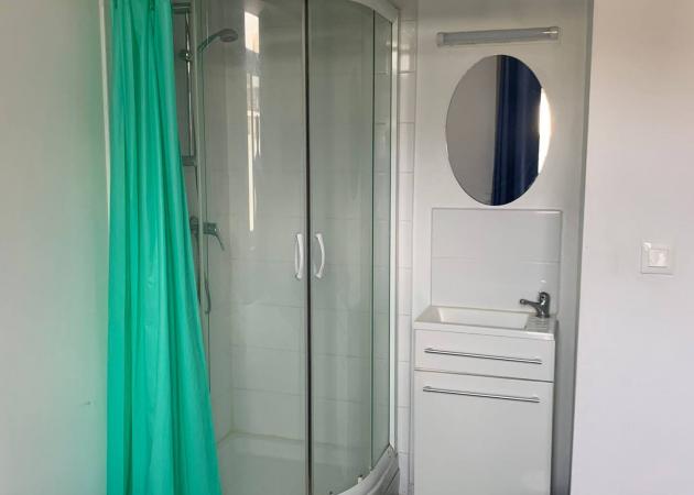 Salle de bain privée en dehors de la chambre avec douche et lavabo.