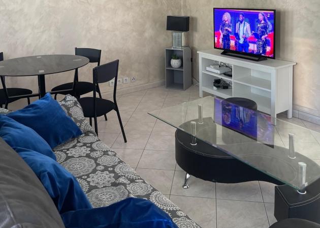 Spacieux et lumineux avec accès à un balcon : canapé 3 places, 2 poufs, table basse en verre, TV 4K HD (139 cm) et coin repas.