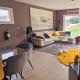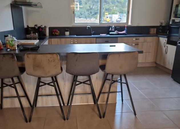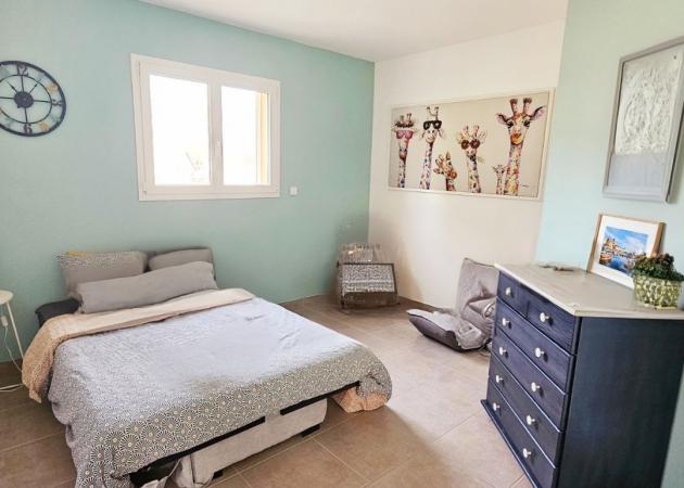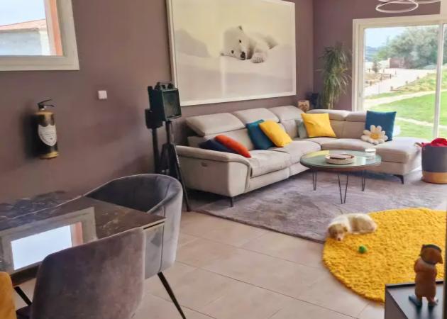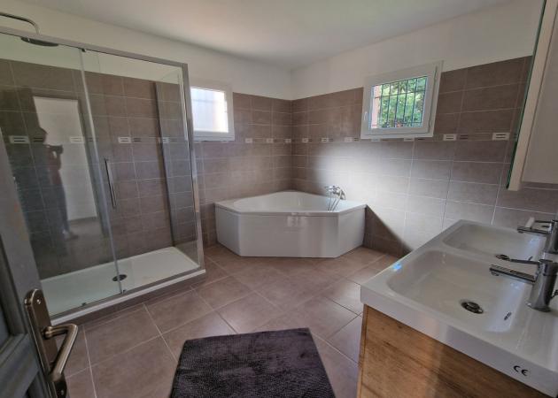 La maison dispose d'une cuisine équipée ouverte sur un salon/salle à manger spacieux, d’une salle de bain avec douche et baignoire, de deux WC et de nombreuses baies vitrées.