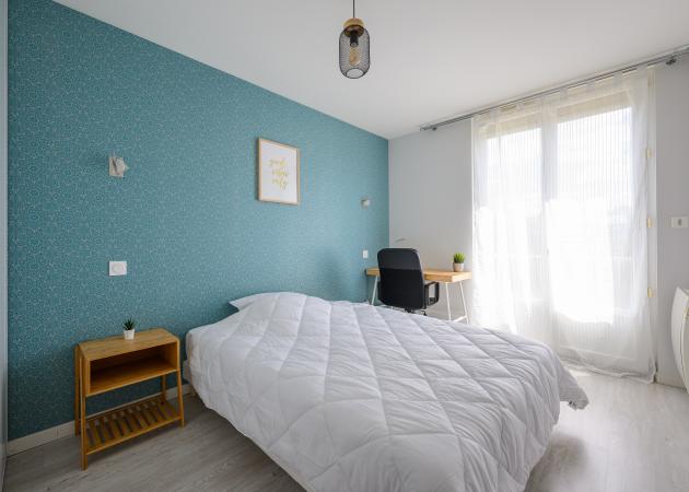 Chambre 3 / Surface : 10m2 Aménagée : d'un grand lit, d’une armoire ainsi que d'un bureau et d'une chaise. La fenêtre est en double vitrage et comprend des volets roulants électriques, avec une belle vue sur un espace vert dégagé, plein sud.