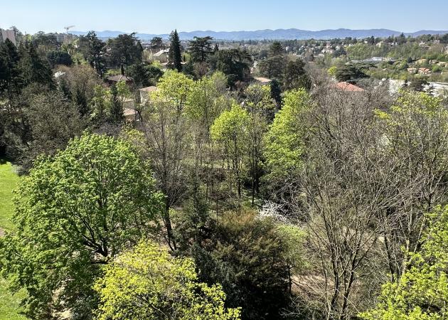 A l'arrivée des beaux jours, vous profiterez d'un large parc de la résidence avec une vue sur les Monts du Lyonnais, sans aucun vis-à-vis.