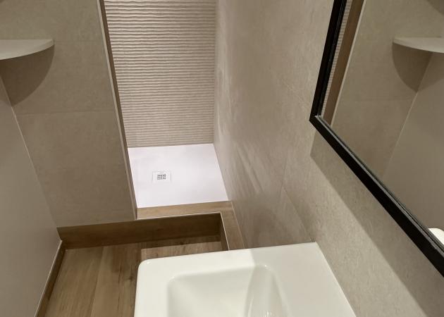 Salle de bains moderne et fonctionnelle, toilette séparé avec lave-mains, ainsi que de nombreux rangements.