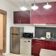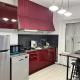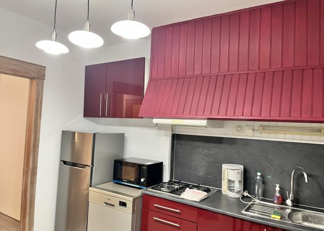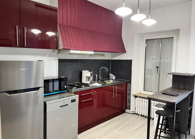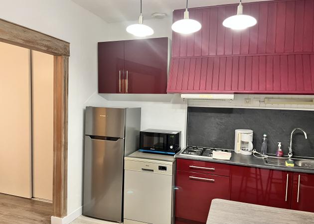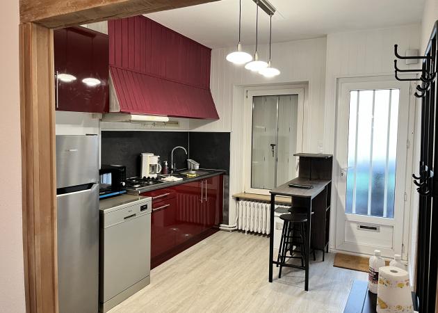 La cuisine est entièrement équipée : machine à café, lave-vaisselle, réfrigérateur, vaisselle et ustensiles.