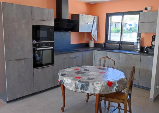 - cuisine équipée avec frigo + microonde + four + lave-vaisselle + table,