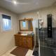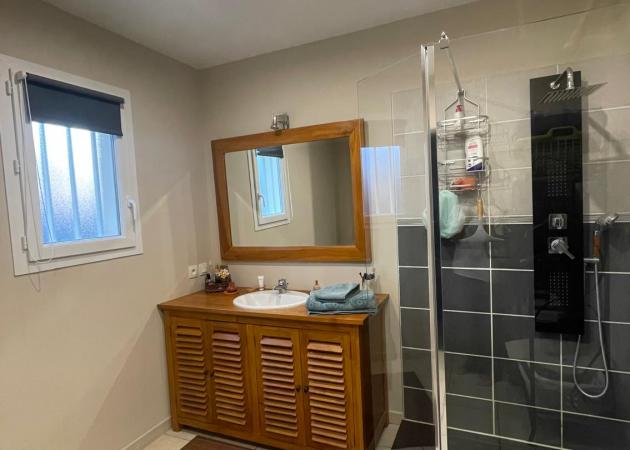 SDB équipée d’une douche, d’une vasque et d’un WC.