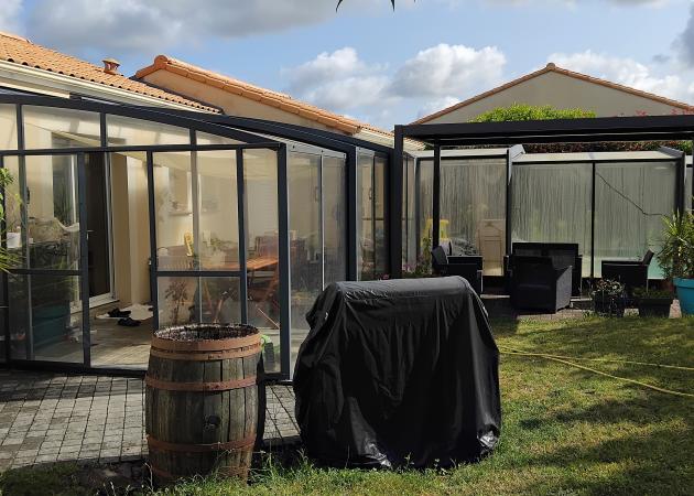 Accès au jardin avec barbecue et à la véranda équipée d’un frigo, d'un mini-four, d’une cafetière et d’un micro-ondes.