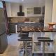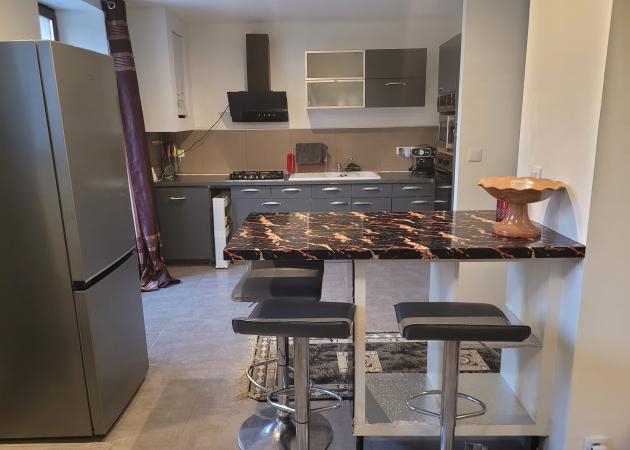 Une cuisine toute équipée : réfrigérateur/ congélateur, plaques de cuisson gaz, micro-onde, vaisselles, casseroles poêles, machine à café expresso, grille-pain.