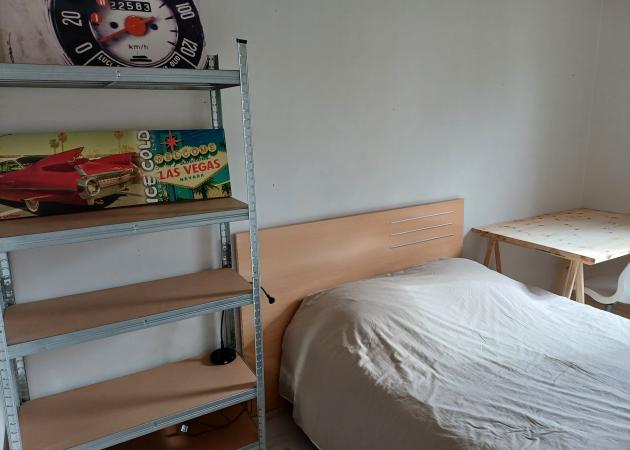 Dans la chambre, à disposition, un lit 140, un bureau, une étagère.