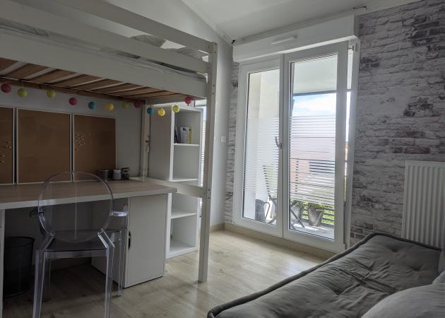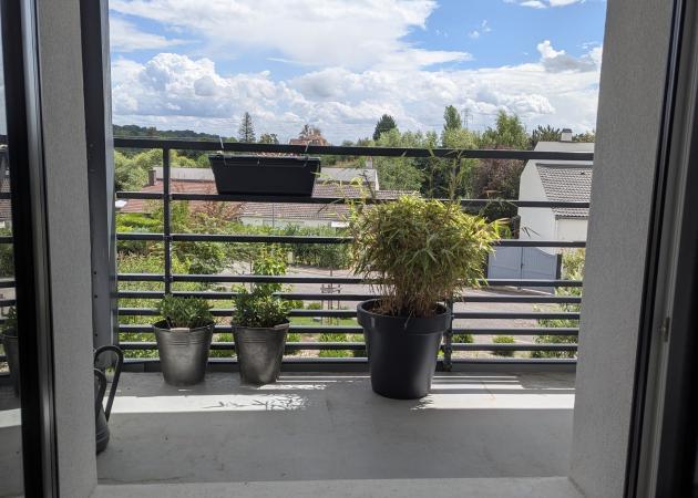 Accès direct balcon vue agréable et dégagée-Salle d’eau et WC attenants à partager avec occupant·e de l’autre chambre du palier.