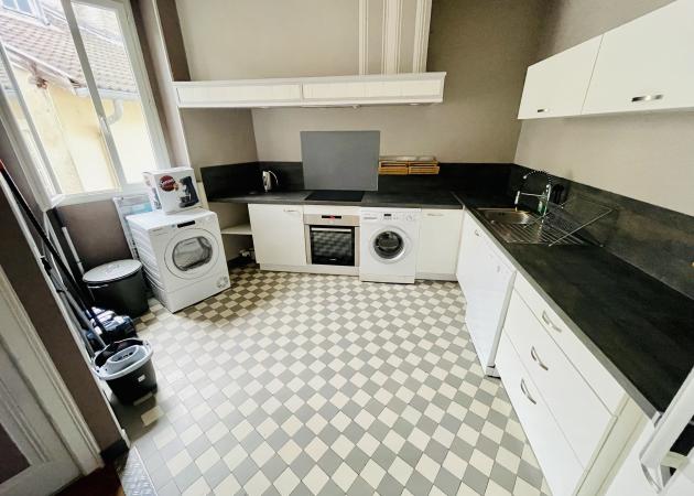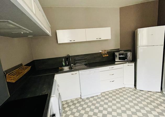 Un espace commun de cuisine, comprenant tout l’essentiel à la vie en communauté grâce à sa grande table centrale propice aux échanges, lave-vaisselle, lave-linge, sèche-linge, four, micro-onde, 4 plaques vitro, machine à café et bouilloire permettront de se restaurer.