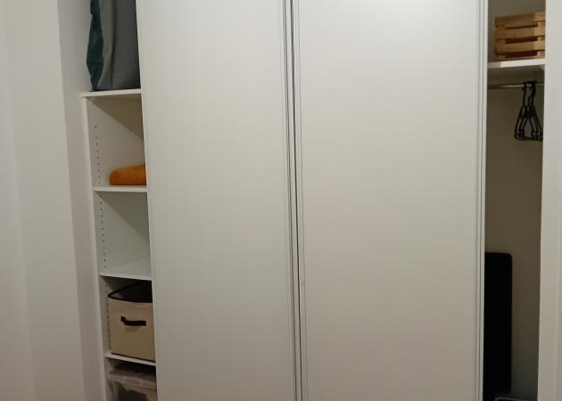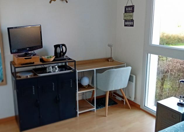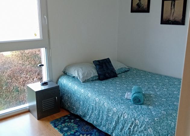La chambre est équipée d'un lit double, d'une table de chevet, de 2 petits bureaux, de 2 chaises, de grands placards et d’un meuble de rangement dans lequel de la vaisselle de base est fournie pour préparer des repas basiques et vous offrir plus d’indépendance.