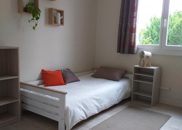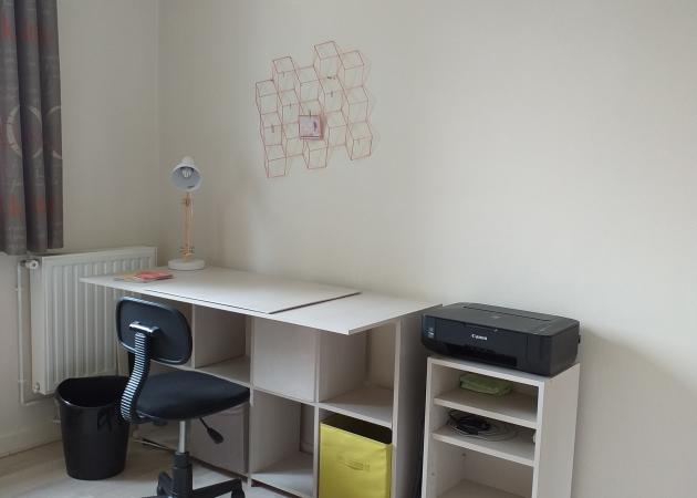 la chambre est équipée d'un lit 1 personne, d'un grand bureau, d'un grand placard mural, d'une imprimante.