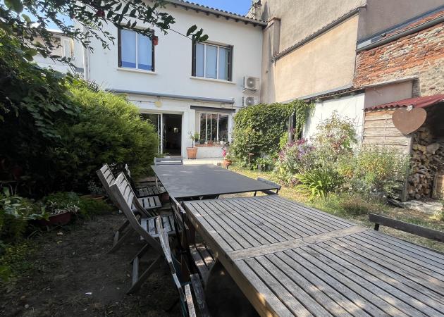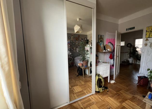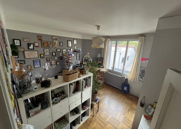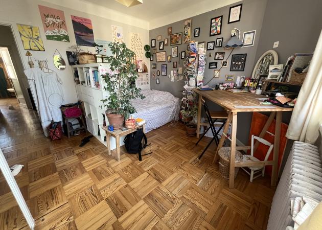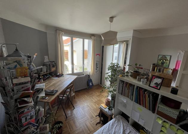 La chambre est à l'étage dans une maison de 180m², située à 3mn à pied du métro Claude Nougaro dans une rue paisible du quartier des Minimes. Elle est meublée avec un lit de 140cm, un grand bureau, une étagère à casier et un double placard avec portes coulissantes. Le sol est en parquet d'origine.
