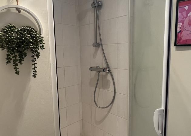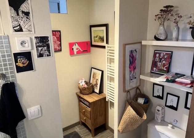 La salle de bain avec toilette située au rez-de-chaussée est à partager avec deux autres personnes. Elle est équipée d'une douche.