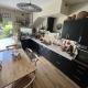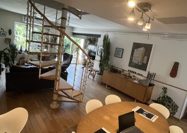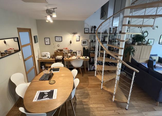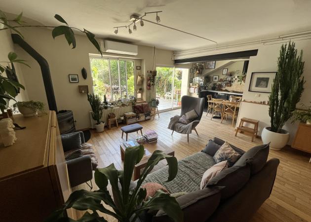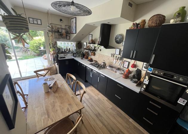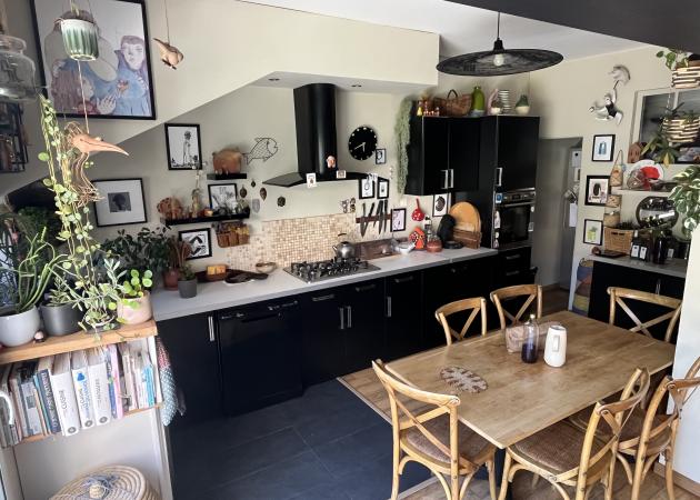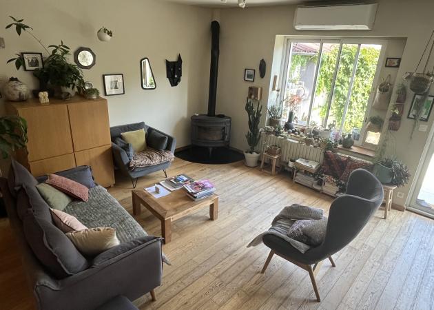 Le rez-de-chaussée est principalement occupée par une grande salle commune donnant sur le jardin de 200m² qui se trouve à l'arrière de la maison. Une cuisine fonctionnelle s'ouvre sur la salle commune. Le rez-de-chaussée est entièrement chauffé au bois (poêle).