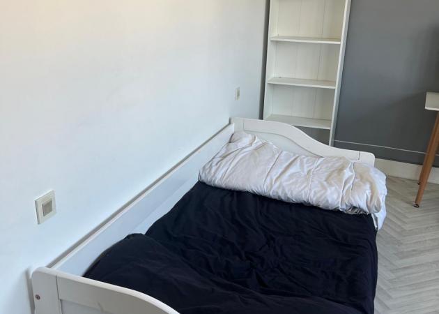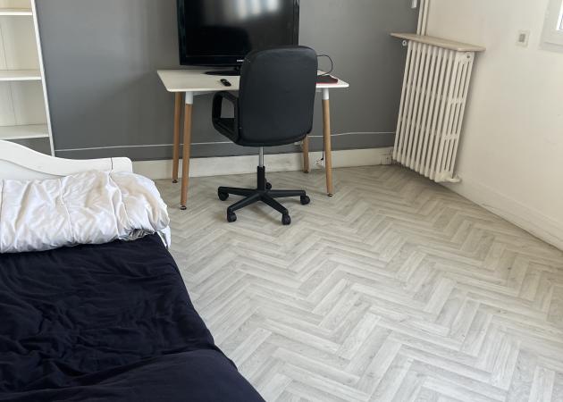 Grande chambre avec lit bureau armoire. Cuisine, wc et sdb à partager.
