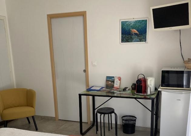 Elle est équipée, d’un petit réfrigérateur, un micro onde, machine à café, bouilloire, TV, bureau.