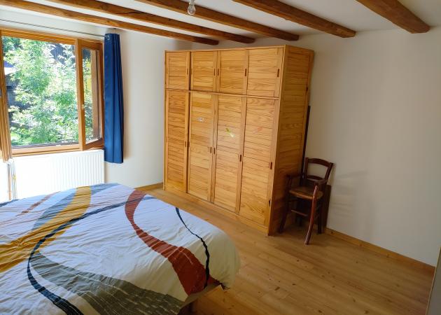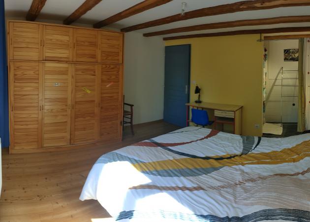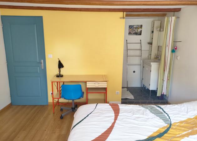 La chambre est équipée d'un lit double, d'un bureau et d'une grande armoire penderie.