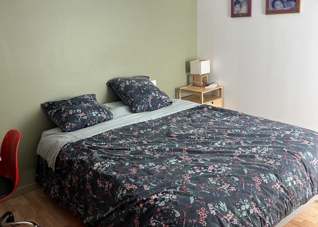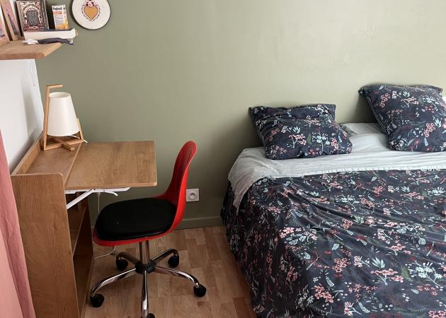 Chambre de 13 m² confortable et fonctionnelle, située dans une maison accueillante. Elle dispose d’un lit, d’une table de chevet avec lampe, ainsi que d’un espace de travail avec petit bureau et chaise, idéal pour télétravailler ou étudier.