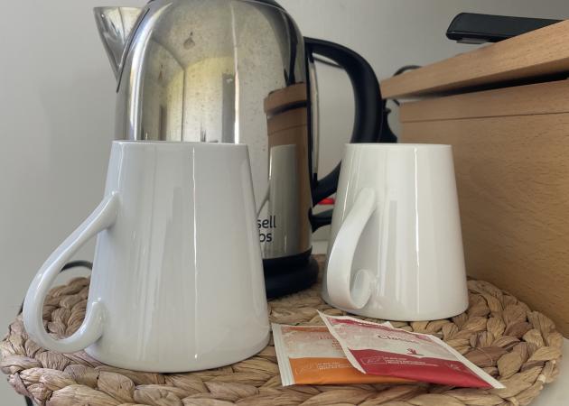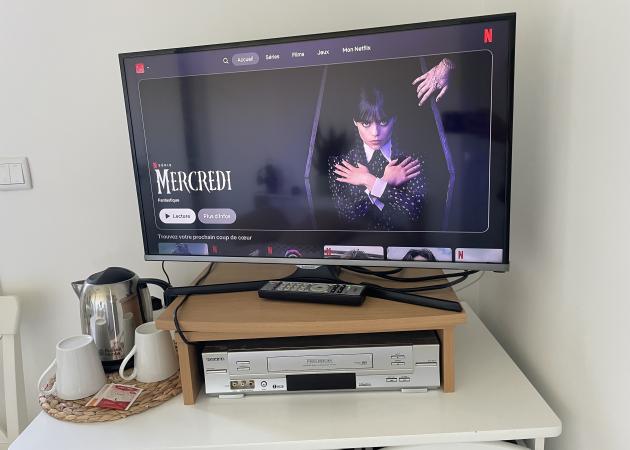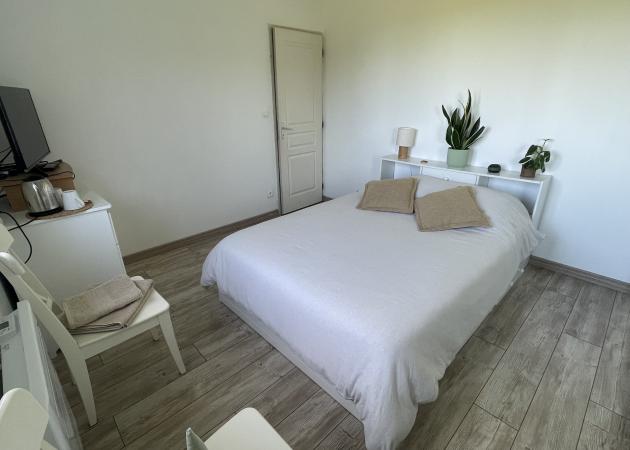 Un Lit double dans une chambre de 12 m2, commode, équipée de Netflix, Prime, Disney+, bouilloire, linge de lit et serviettes fournies.