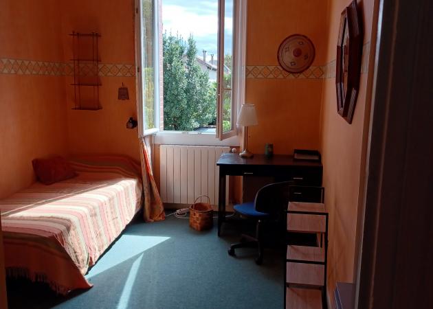 une chambre de 12m2 ,1er étage donnant sur jardin. dans annexe : bouilloire et micro-onde; possibilité d'utiliser la cuisine sur demande . salle de bain et wc à partager . accès wifi . pas d'animal de compagnie . interdiction de fumer . soirée interdite .Calme absolue de 22h à 8h .