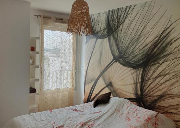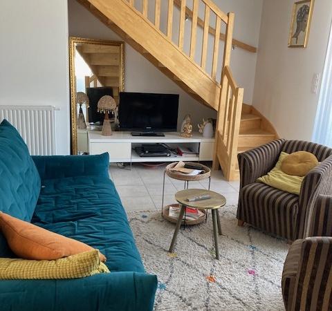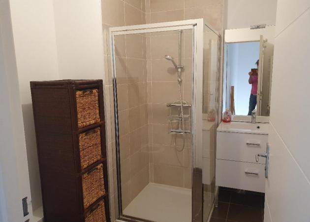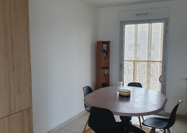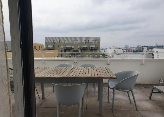 Terrasse de 35 m2 donnant vue sur Rennes, loggi, salon salle à manger à partager ainsi que la cuisine aménagée.