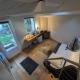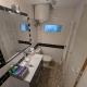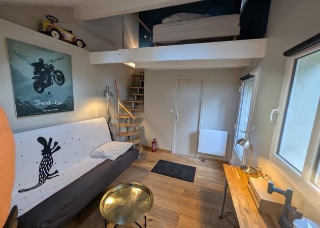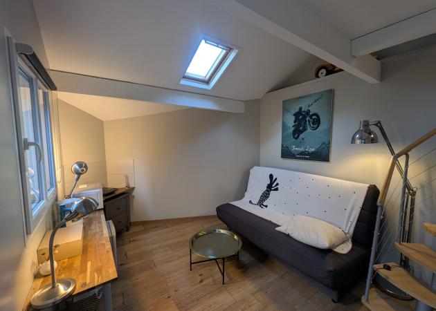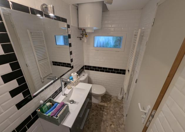 Salle de bain et petite pièce à vivre avec canapé au rez-de-chaussée.