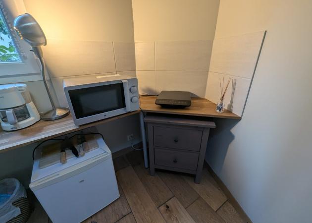 Four micro-ondes, plaque chauffante et réfrigérateur.
