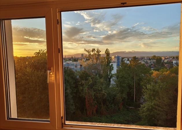 À part mon fils, c'est très calme ici et il n'y a pas beaucoup de bruit. Il y a une belle vue depuis le balcon. Le magasin le plus proche est à 5 minutes à pied. L'arrêt de bus est également à 5 minutes et la gare de Mulhouse est à 15 minutes.