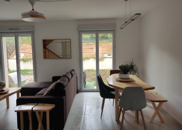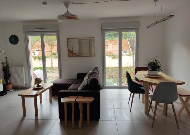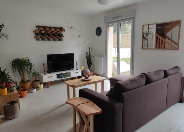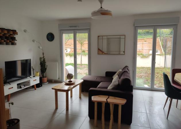 Dans une jolie maison neuve de 2025 (85 m²) avec un jardin de 100 m², deux salles de bain, un salon lumineux et une cuisine toute équipée.