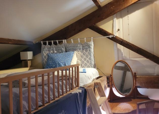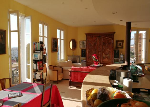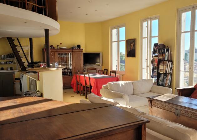 Le séjour, très lumineux la cuisine américaine et les WC- douche sont en parties communes, la mezzanine est totalement privative.