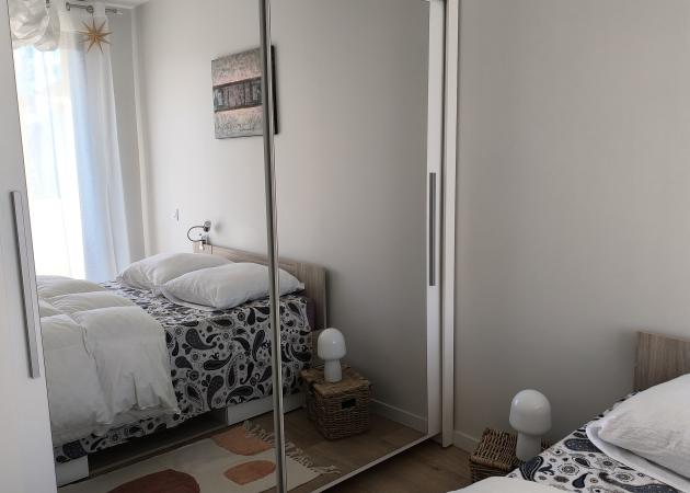 La chambre présente un grand lit, une armoire avec cintres, un bureau.