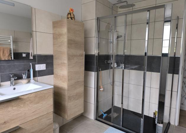Salle de bains avec douche italienne à partager.