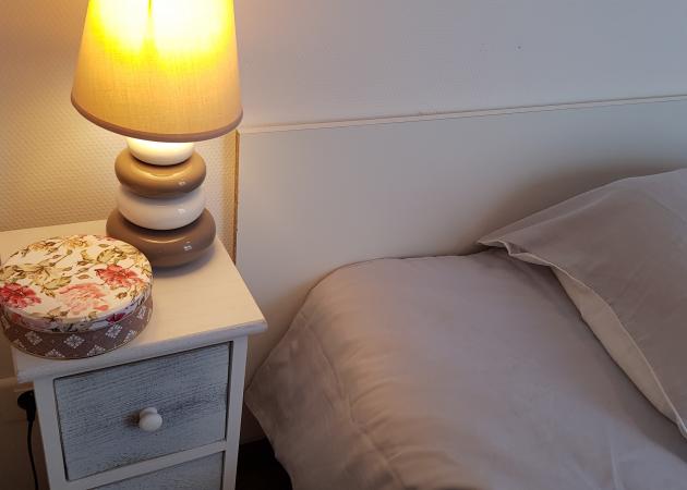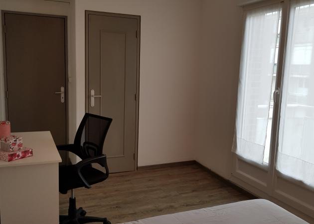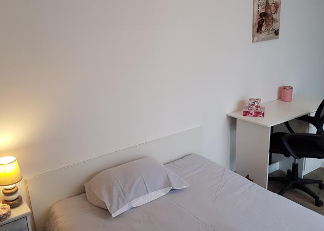_ La chambre aux nuances apaisantes a une surface de 12 m2. Elle est meublée d'un lit 140/190 doté du couchage complet (couette, oreiller, le lit est fait en arrivant) chevet, lampe de chevet, bureau, fauteuil de bureau, placard de rangement, rideaux, balcon particulier à la chambre.