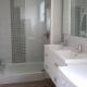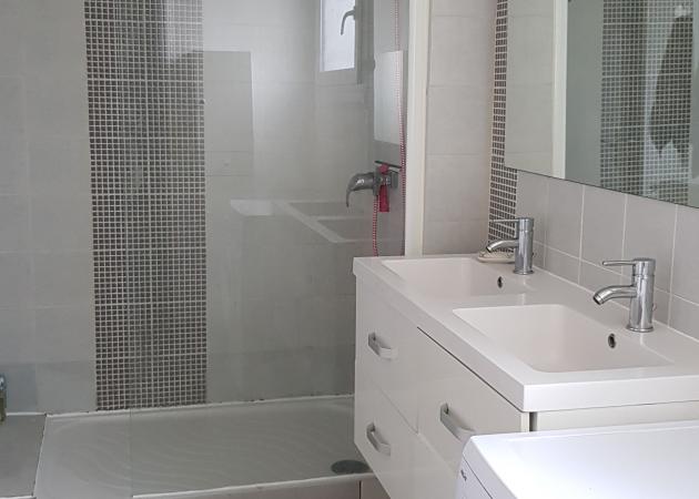 La salle de bains est aménagée: grande douche, double vasque, rangements, lave-linge, table et fer à repasser. WC indépendant.