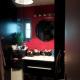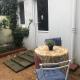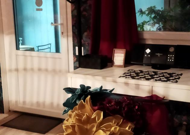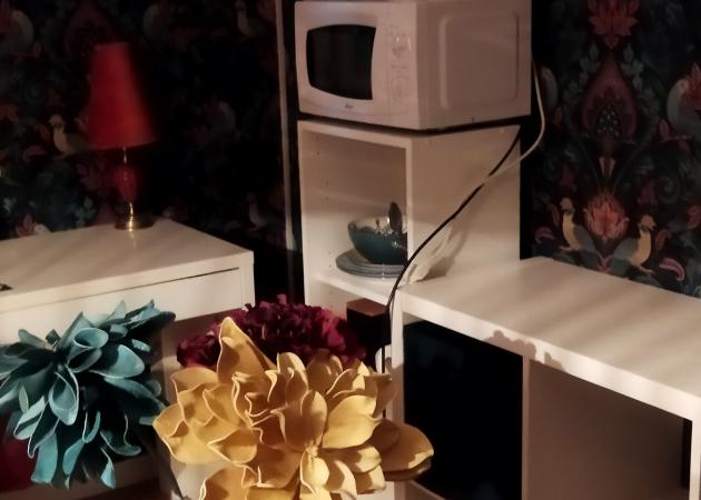 - Un espace repas muni d'une table, d'une chaise, ainsi que d'un micro-ondes, d'une cafetière et d'une théière.