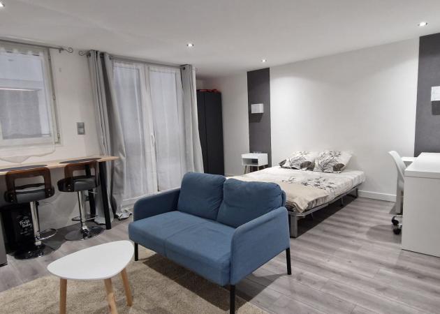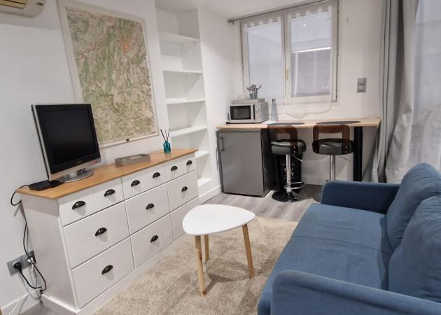 Tout confort : lit 2 places, climatisation réversible, coin kitchenette (frigo, micro-ondes, vaisselle…), bureau, petit salon avec TV, armoire/penderie, salle d’eau avec WC et douche privatifs.