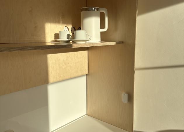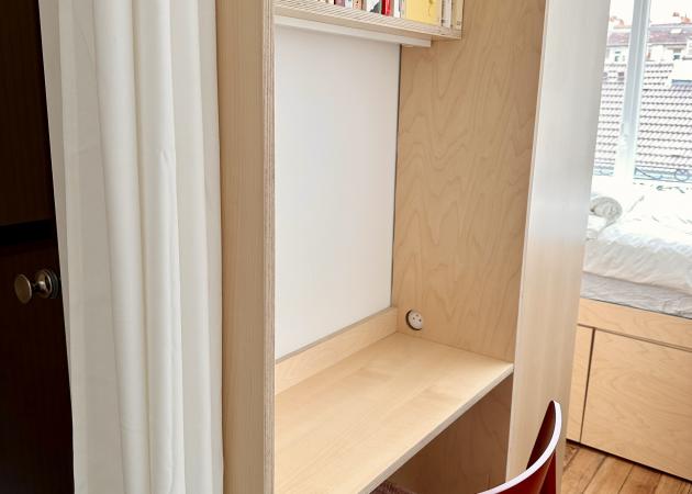 • Lit double, bureau, penderie, kitchenette, wc et douche dans le logement.