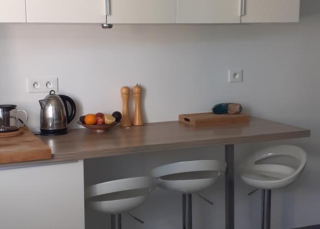 avec accès à une cuisine équipée ( cafetière, bouilloire, micro-onde, frigo, four....) salle de bain, et toilettes.