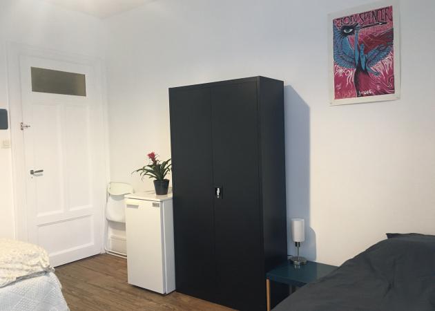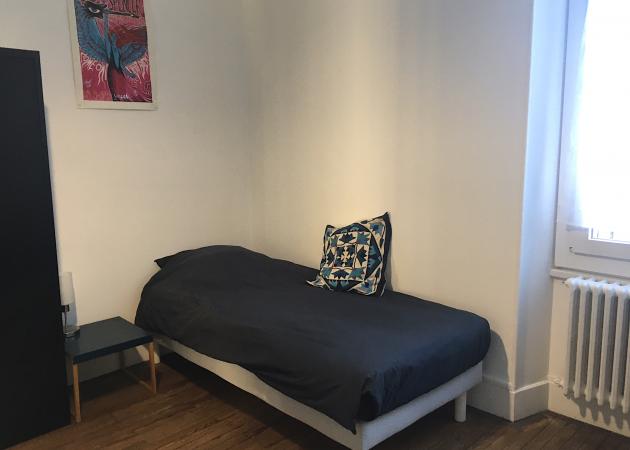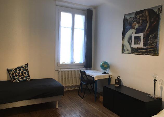 La chambre, offrant un parquet de caractère et une vue dégagée, est équipée de double vitrage. Elle est meublée de deux lits simples, d'un bureau, ainsi que de nombreux rangements. Un réfrigérateur et une bouilloire sont mis à votre disposition dans la chambre. Un micro-ondes peut être fourni sur demande. La vaisselle de base, les draps et les serviettes sont fournis.