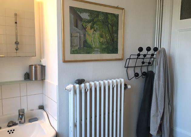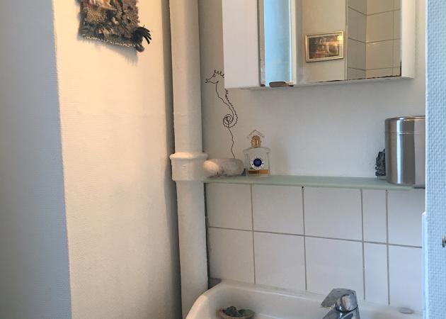La salle de bain et les toilettes, séparés, sont partagés. Il est important de noter la présence d'un jeune chat, Orphée, dans l'appartement.